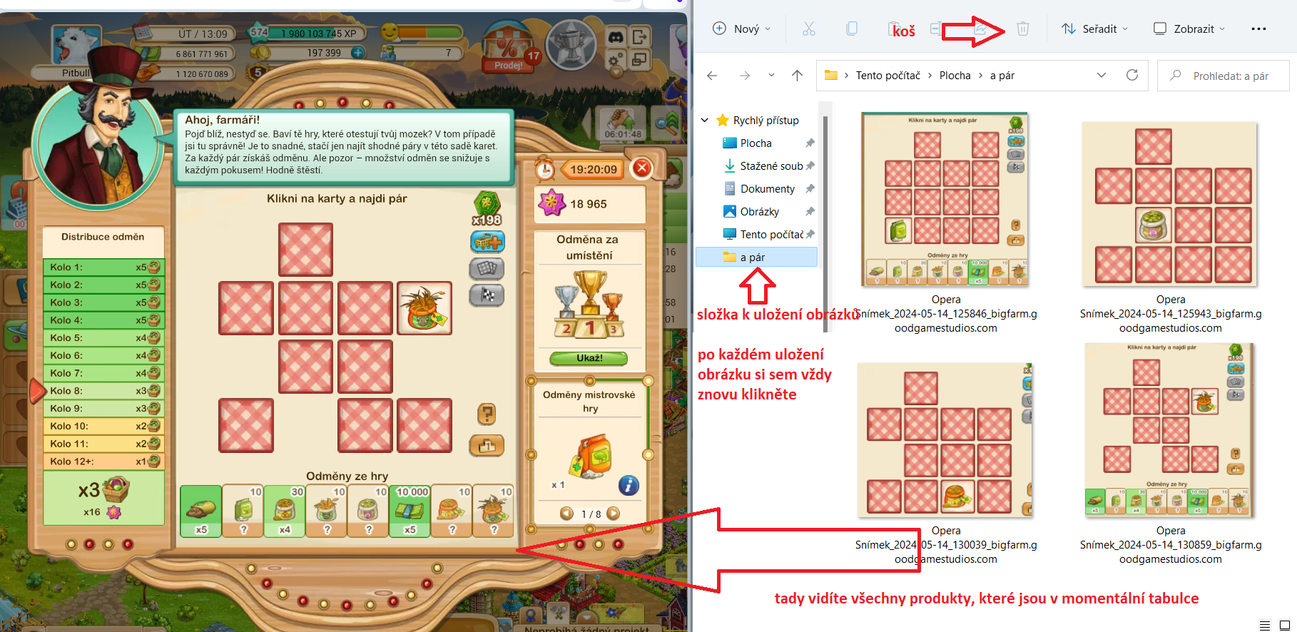 6. A můžete vesele klikat. Vždy si první kartu ofotíte - uložíte, druhou kartu si zapíšete na papír. Karty které zmizí, si ve složce hned vymažete a na papíře škrtnete. Takto můžete jet soutěž donekonečna bez jediné chyby, Občas vám naskočí Mistrovská liga, ve které už jsou o hodně lepší odměny - žetony, fialové krmiva atd.