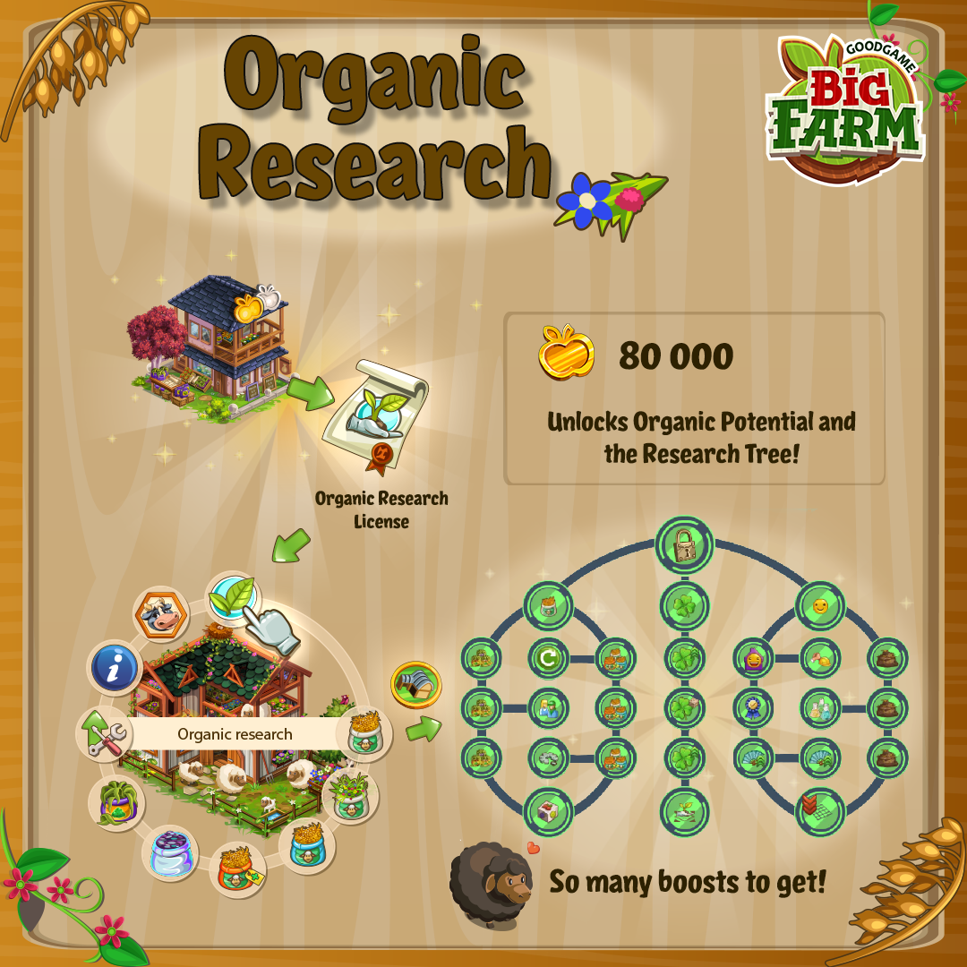 Všechny vaše ovčíny mají organický potenciál. Jakmile odemknete, získáte přístup k nádhernému Organickému výzkumnému stromu, který nabízí mnoho vylepšení pro váš ovčín a vaši farmu!