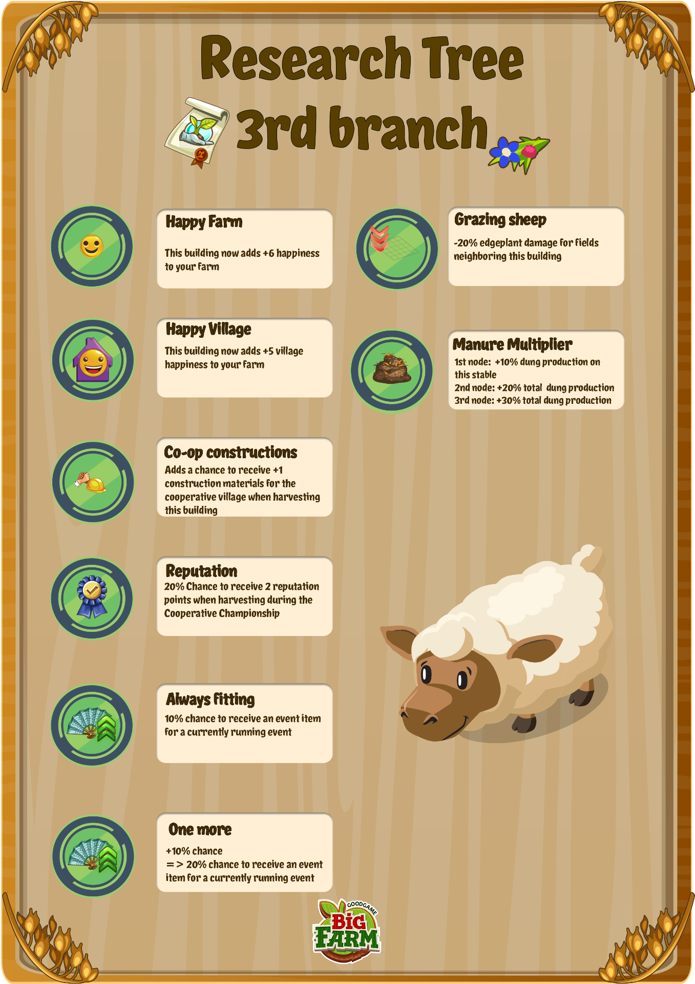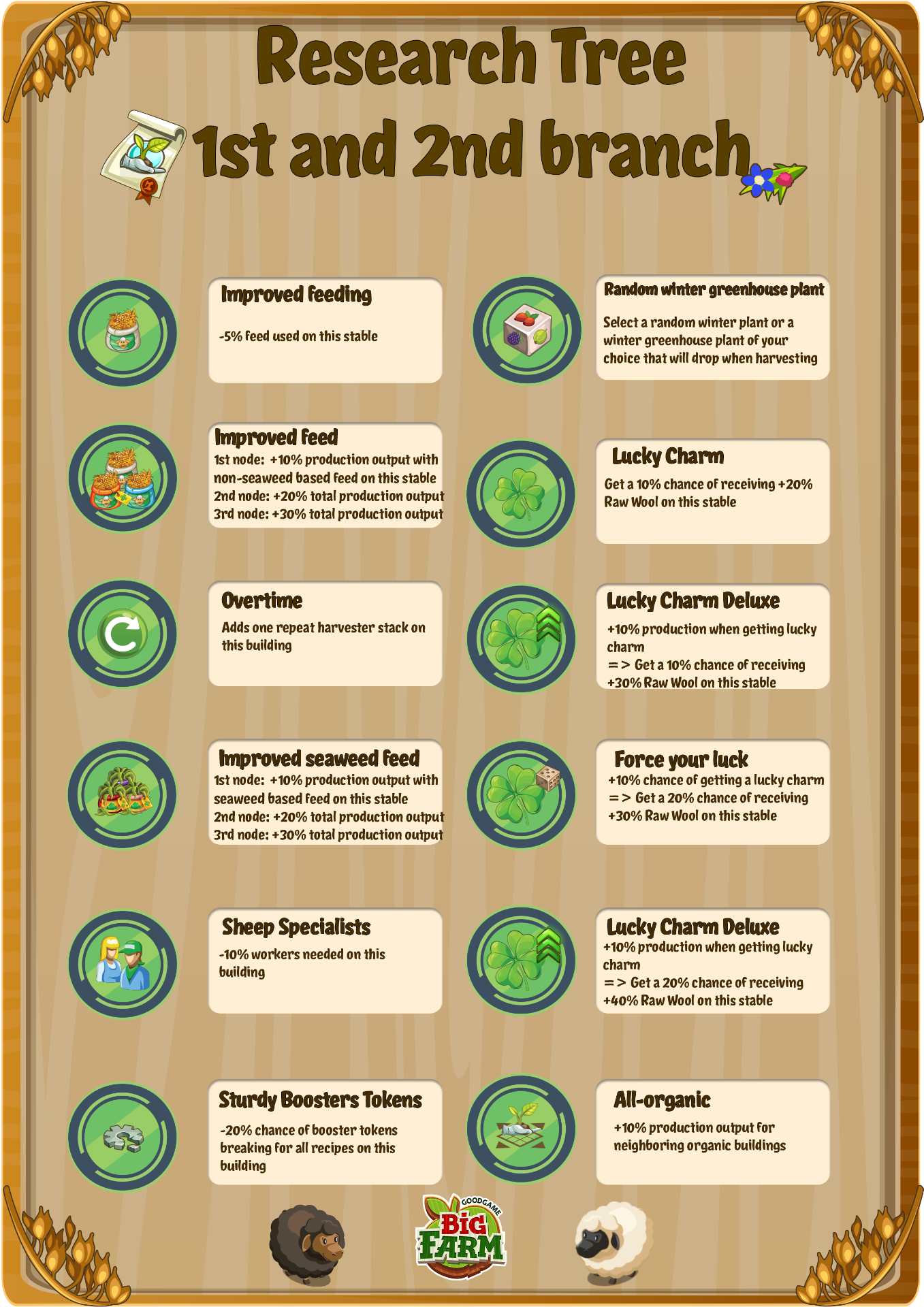 Objevte organický výzkumný strom s jeho třemi různými větvemi. Každá větev má sadu posilovačů a výhod pro váš ovčín a pro vaši farmu!
