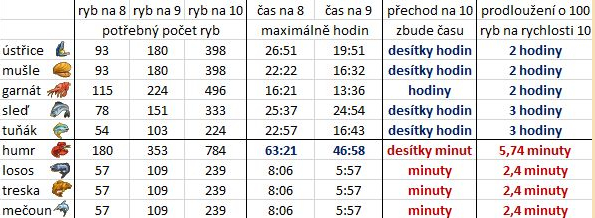 Humr: 1.) 1 - 11 13:12:00 2.) 12 - 24 25:55:12 3.) 25 - 40 36:28:48 4.) 41 - 59 42:28:48 5.) 60 - 82 47:13:55 6.) 83 - 110 47:13:12 7.) 111 - 179 51:33:07 8.) 180 - 352 63:21:36 9.) 353 - 783 46:58:48 10.) 784 Zbydou desítky minut Zkrátí časProdloužení o 100 ryb 2.74 minut