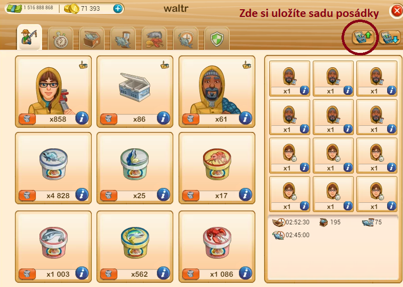 Pojmenujte si lodě a pruty žádejte pouze na názvy lodí, které zrovna potřebujete, nebo budete potřebovat do akce balička - rybí silo.Udice